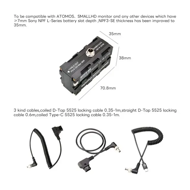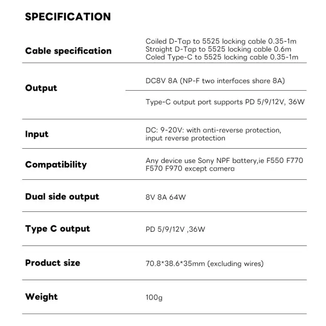 1. 3 kind cables,coiled D-Tap 5525 locking cable 0.35-1m,straight D-Tap 5525 locking cable 0.6m,coiled Type-C 5525 locking cable 0.35-1m.