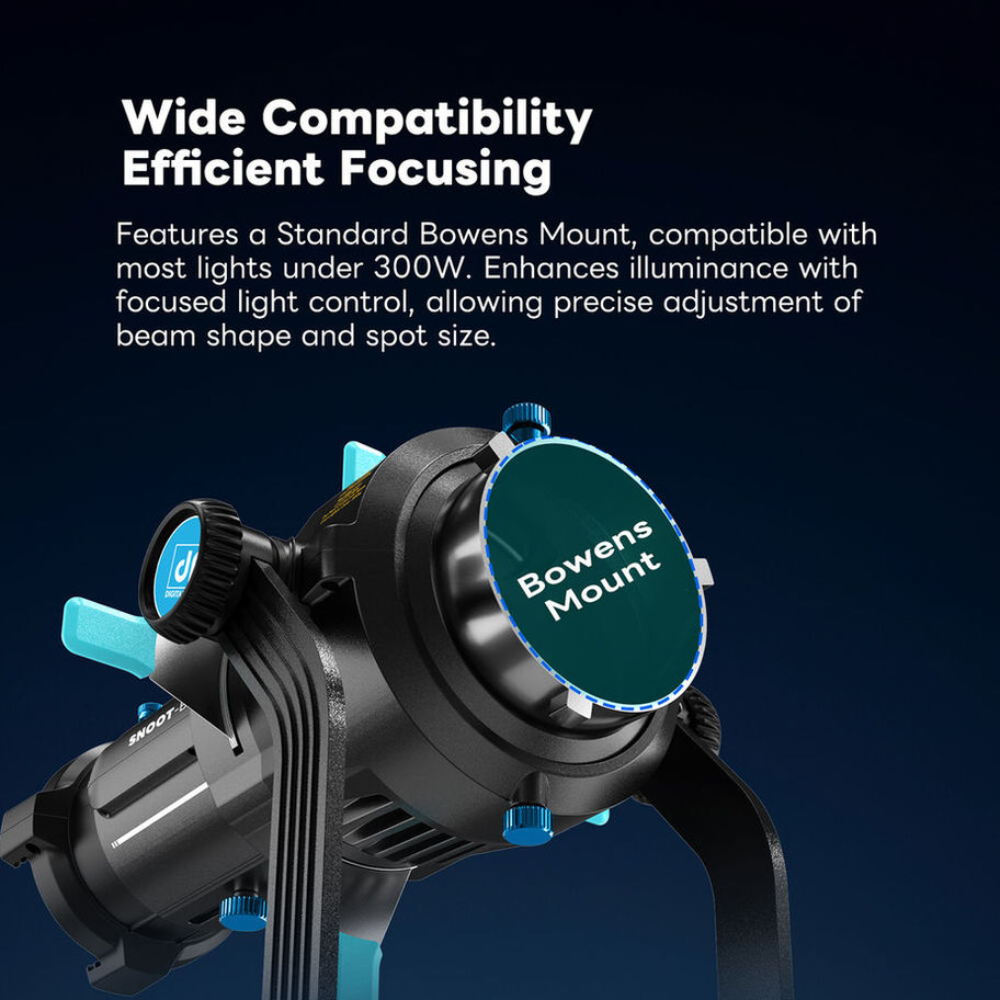 The standard Bowens mount is compatible with most lights under 300W, providing enhanced and focused light control for precise adjustment of beam shape and spot size. Crafted from aerospace-grade aluminum alloy and precision die-casting, this compact snoot features a refined, durable build.